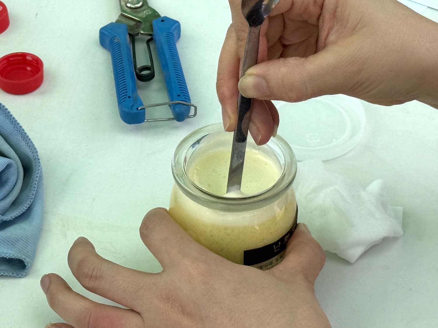 참가자들이 식용유를 혼합해 난황유를 만들었다. ©서울농부포털마요네즈를 활용하면 계란 노른자와 식용유를 이용한 난황유를 대체할 수 있습니다. 효과는 난황유와 비슷하면서도 만드는 방법은 매우 간단하다는 장점이 있습니다.