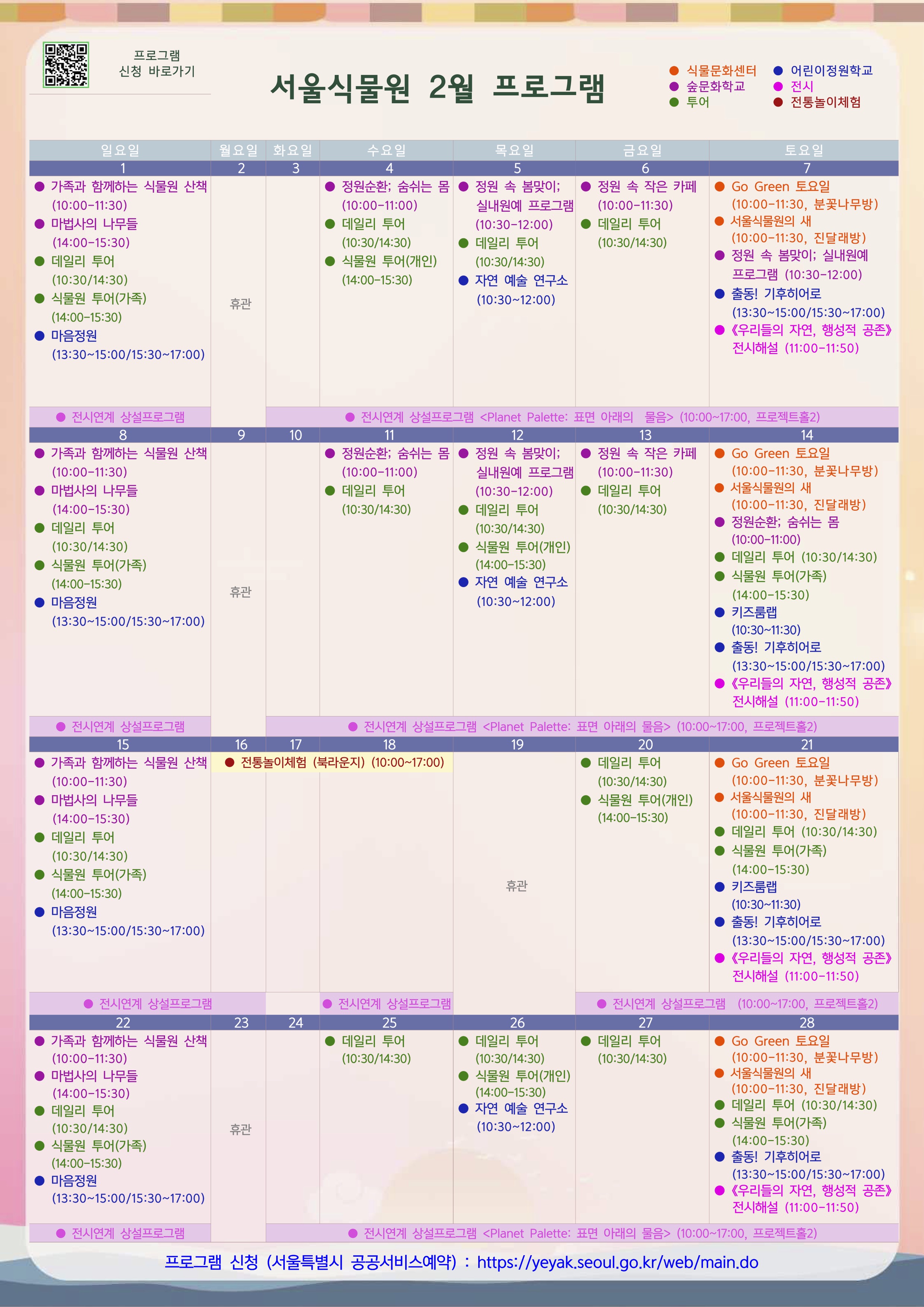 서울식물원 2월 프로그램 ©서울식물원겨울 끝자락의 도시는 여전히 회색빛이지만, 서울식물원의 온실과 정원, 호수와 습지를 잇는 동선 위에서는 봄을 준비하는 생명의 리듬이 먼저 움직여 '다음 계절'을 만들고 있습니다. 잠시라도 따뜻한 색을 눈에 담고 싶거나, 자연을 만끽하는 시간을 갖고 싶다면 서울식물원의 흐름에 몸을 맡기고 천천히 걸어보는 것도 좋겠습니다. 서울식물원의 좀 더 자세한 일정과 내용은 홈페이지(