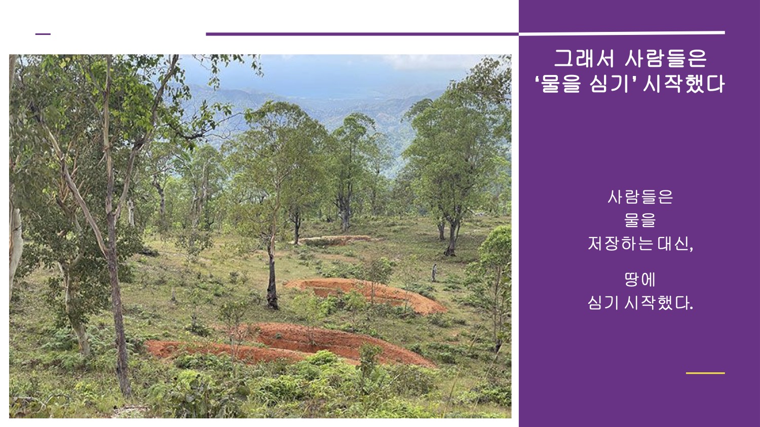"IPYC 2025"의 주제이자 핵심 사례로 제시된 'Planting Water'는 물 부족이 아니라 물이 머물지 못하는 땅이 문제라는 진단에서 시작했습니다. 토마저씨는 "모든 변화의 시작은 물이었다"면서도 "문제는 물의 양이 아니라, 물이 머물 수 없는 땅이었다"고 강조했습니다. 그래서 사람들은 물을 저장하는 대신, 땅에 심기 시작했고, 그 결과 "빗물을 붙잡아 땅이 살아나고 마을의 시간이 다시 흐르기 시작했다"고 설명했습니다. 물이 머무르자 땅이 먼저 반응했고, 이어 삶의 리듬과 마을이 회복됐다는 것입니다.