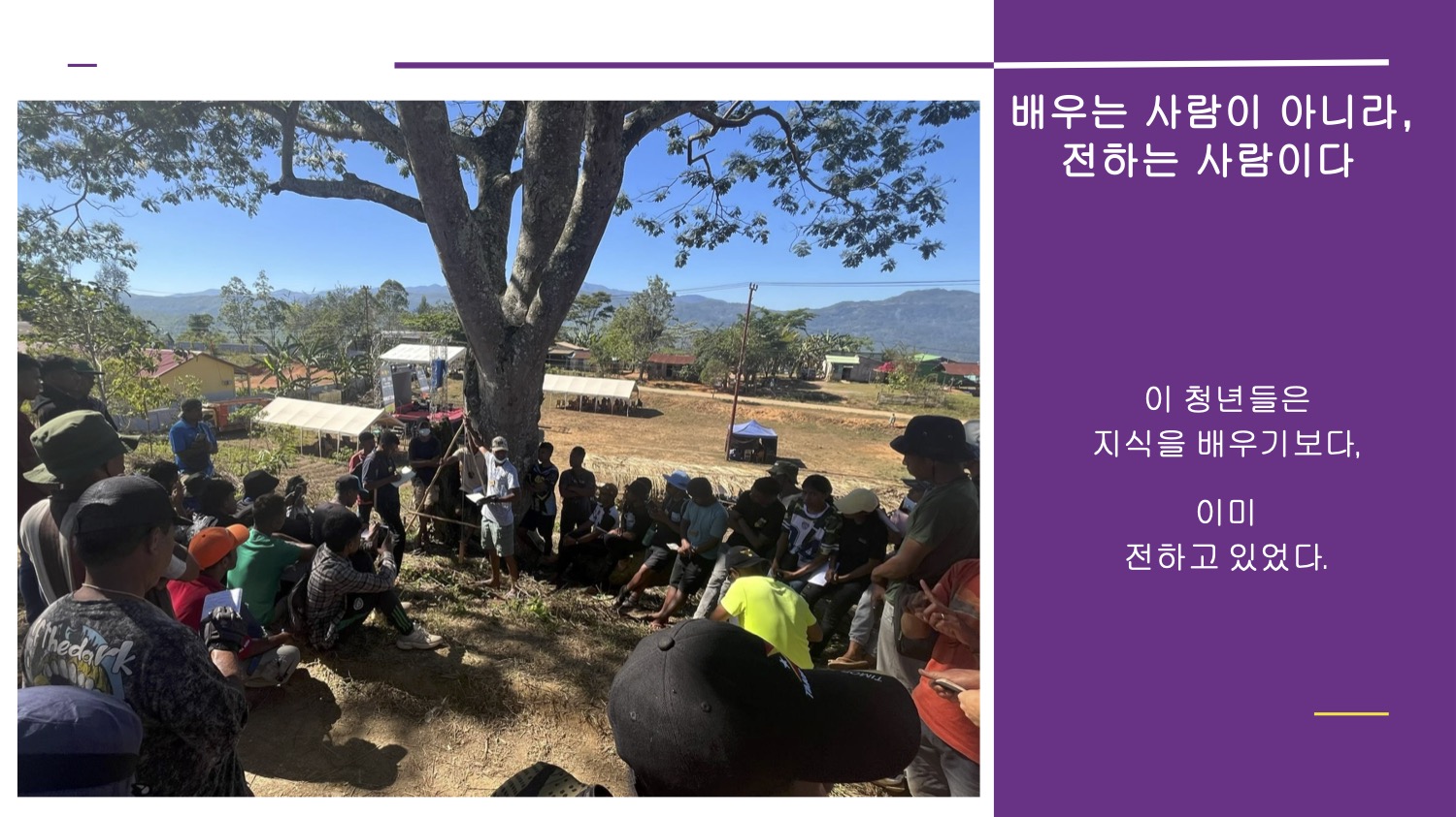 끝으로 "동티모르 친구들은 심심한 생활이지만 권태롭거나 지쳐 보이지 않더라"며 "그들은 기꺼이 서로를 돕고 지키는 사람들"이었다고 전한 너머는 "청년이 뭔지 아직도 모르겠지만 그곳에서는 모두가 청년이었다"고 말하며 발표를 마무리했습니다.
