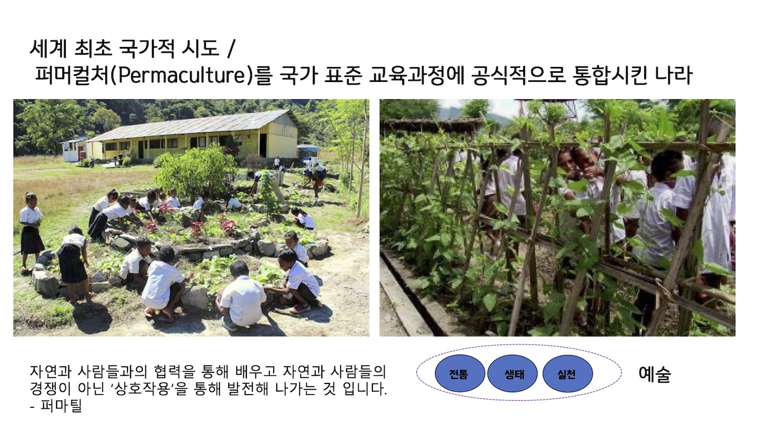 동티모르는 2015년 초등교육과정에 퍼머컬처를 통합시켜 242개 학교, 41000명 이상의 학생에게 교육을 진행하고 있습니다. 그 배경은 농업기술 보급이 아니라 국가 정체성의 회복이었습니다. 이슬은 "동티모르에서는 오랜 식민지배 이후 전통을 업신여기는 풍조가 들었고, 전통적 가치를 더 견고히 하기 위해 국가는 퍼머컬처를 선택했다"고 이유를 설명했습니다. 즉 동티모르에서 퍼머컬처는 새로운 농업 기술이 아니라, 잃어버린 가치를 다시 세우는 교육 언어라는 뜻입니다.