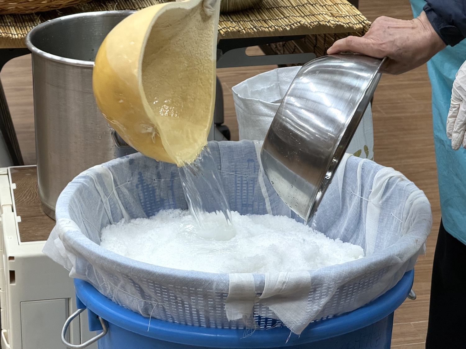 3. 소쿠리에 삶은 콩을 쏟아 콩물이 빠지면 으깨서 메주를 만든다.