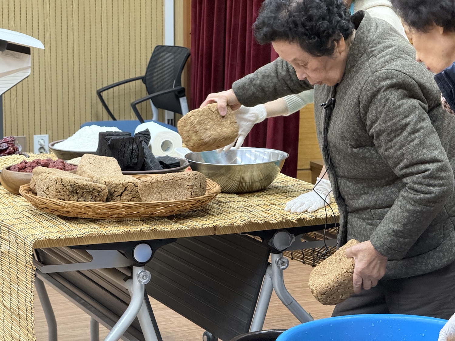 강좌에서 조숙자 명인이 된장∙간장 만들기 시연을 하고 있다. ©서울농부포털강좌에서 전해진 명인의 숙성의 시간에 대한 철학도 인상적이었습니다. 조숙자 명인은 "햇장(1년)도 좋지만, 묵은장(3-4년)은 더 깊고 진한 맛이 난다"며 오래 두고 보살핀 장의 가치를 짚었습니다. 또한 묵은장이나 항아리 밑의 굳은 소금을 활용해 새 장을 담그는 '겹장'도 소개되었습니다. "겹장은 메주가 두 번 들어가는 거니까 더 좋지요." 시간을 겹쳐 사용하는 전통 지혜가 담긴 장 담그기 방식이 번거로움을 피하려는 오늘날에도 충분히 적용될 수 있음을 보여준 대목이었습니다.