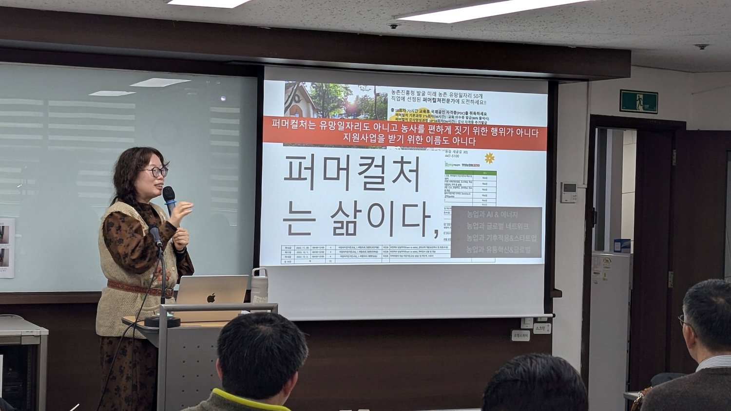 소란 한국퍼머컬처네트워크 대표 활동가가 "퍼머컬쳐네트워크 활동 및 조직운영 사례"에 대한 특강을 진행하고 있다. ©서울농부포털소란 대표 활동가는 먼저 "원래 퍼머컬처는 혁명가들의 사상이었고, 문화를 바꾸자는 운동"이었다며, 그래서 작물을 어떻게 심을까 하는 농사 기법이 아니라 "왜 심어야 하느냐, 이걸 누구와 나누며 함께 할 것인가"가 퍼머컬처의 핵심 질문이라고 말했습니다. "밭을 설계하되 거기서 멈추지 않고 마을과 연결되고 지역과 연결되고 공동체와 연결되는 상상력을 끝까지 밀어붙이는 것이 퍼머컬처 디자인"이라고 전한 소란 대표 활동가는 "그 힘은 농사 기술이 아니라 사람들 사이의 '돌봄'과 '연결'에서 나온다"고 강조했습니다.