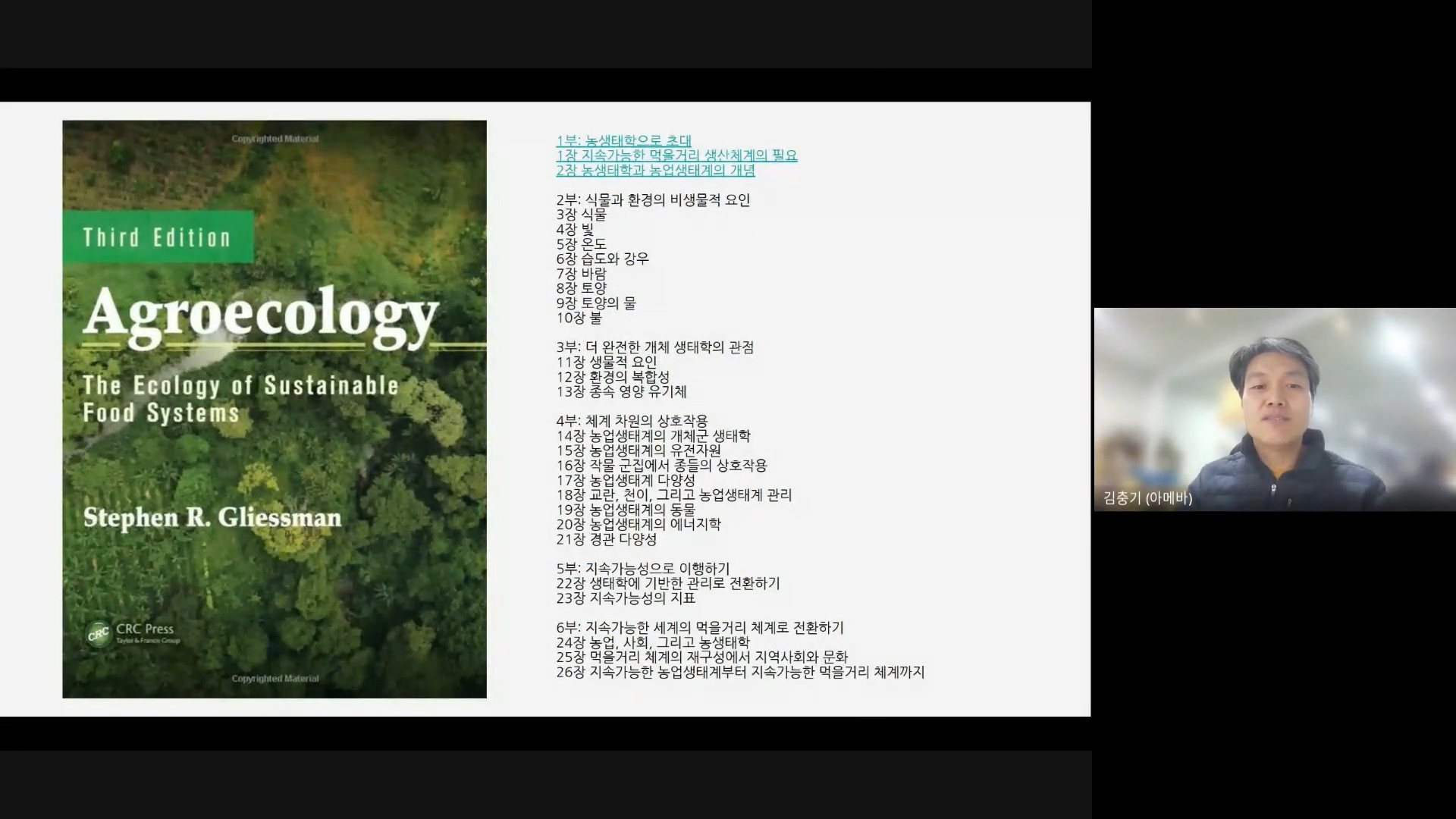©'농생태학 공부 모임' 구글 미트 갈무리2장 발제는 이러한 문제의식을 바탕으로 농업을 생태계의 언어로 읽어내는 작업이었습니다. 김충기 대표는 농장을 단순히 작물을 재배하는 공간으로 볼 것이 아니라, 생물적 요소와 비생물적 요소가 복합적으로 상호작용하는 생태계로 이해해야 한다고 설명했습니다. 하나의 작물만 놓고 보는 것이 아니라, 그 작물을 둘러싼 토양과 물, 공기, 미생물, 곤충, 잡초, 주변 식생과 경관까지 함께 봐야 농업의 지속가능성을 제대로 설명할 수 있다는 뜻입니다.