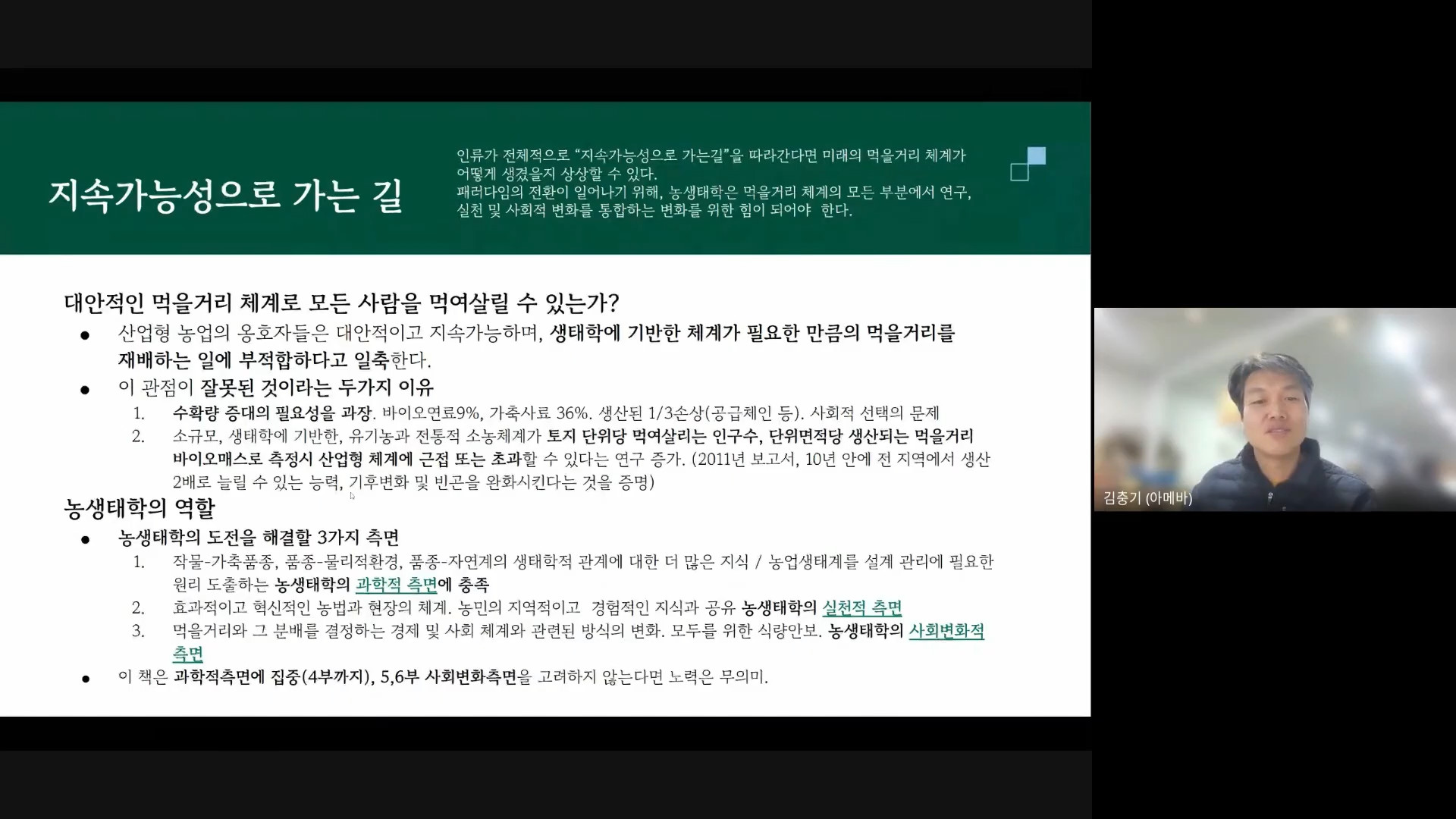 ©'농생태학 공부 모임' 구글 미트 갈무리김충기 대표는 이 같은 문제의식 위에서 '지속가능한 먹을거리 체계'가 무엇인지도 짚어 나갔습니다. 김충기 대표에 따르면 지속가능성은 추상적 구호가 아니라, 구체적인 기준과 방향을 갖춘 실천의 언어여야 합니다. 최소한 농업이 환경에 미치는 부정적 영향을 줄이고, 온실가스 배출을 낮추며, 토양 비옥도를 보존하고 재건해야 합니다. 또한 지하수와 물을 과소비하지 않고, 농업생태계 안에서 양분이 순환하도록 설계해야 하며, 생물다양성을 보전하고 지역사회가 지식과 기술, 먹을거리 체계에 보다 평등하게 접근할 수 있어야 합니다. 여기에 식량안보와 식량권, 지역 중심의 통제력 회복, 정치적·경제적 불이익의 완화까지 포함될 때 비로소 지속가능한 먹을거리 체계에 가까워질 수 있다는 설명입니다.