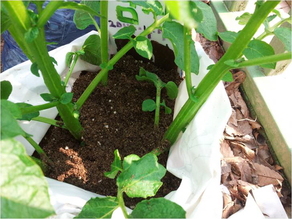△ 4월 7일에 포대에 심어 4월 21일에 싹이난 감자 (사진제공 : 김수향(텃밭강사, 도시농업 활동가))