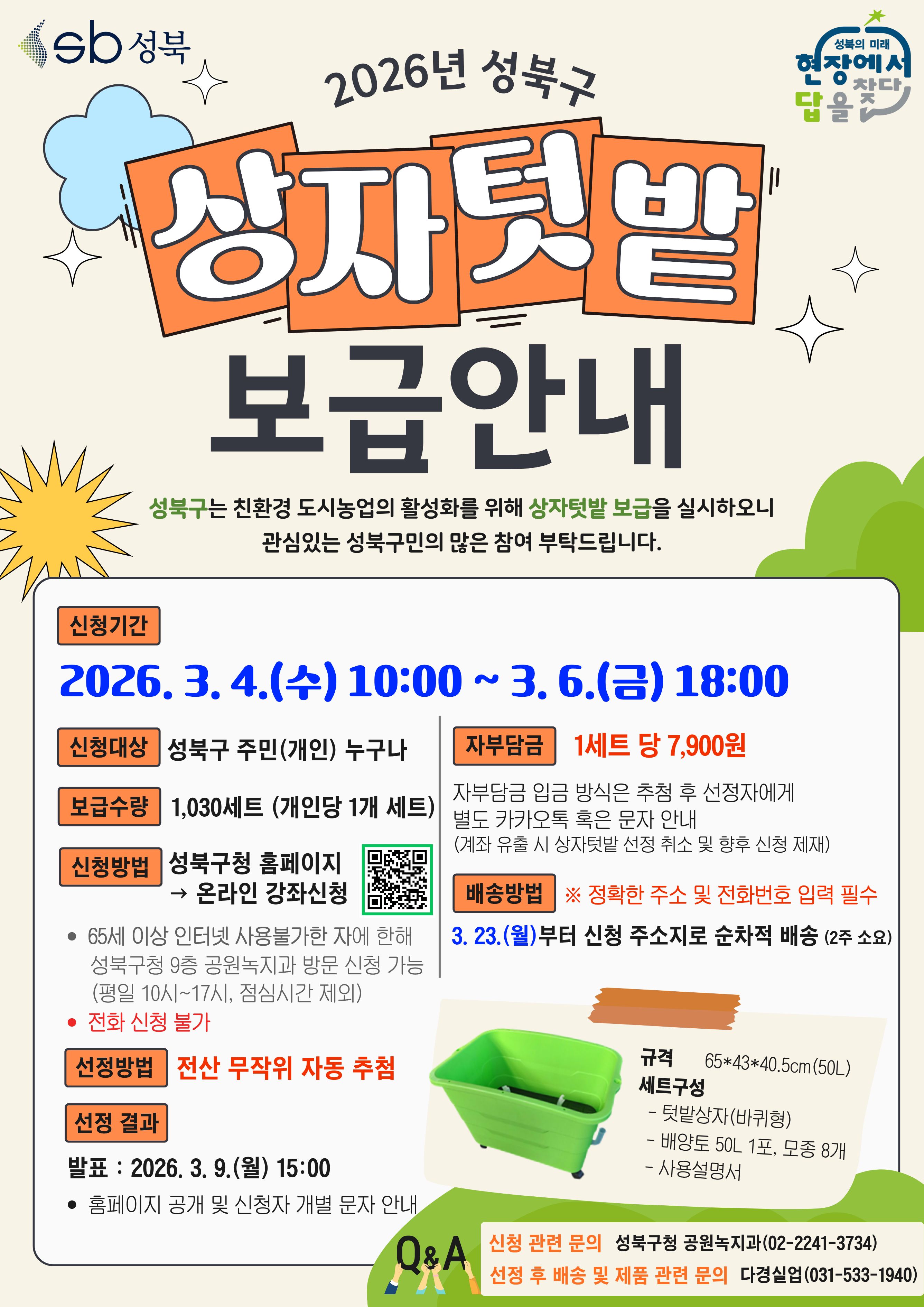 성북구는 친환경 도시농업의 활성화를 위해 상자텃밭 보급을 실시하오니 관심있는 성북구민의 많은 참여 부탁드립니다.